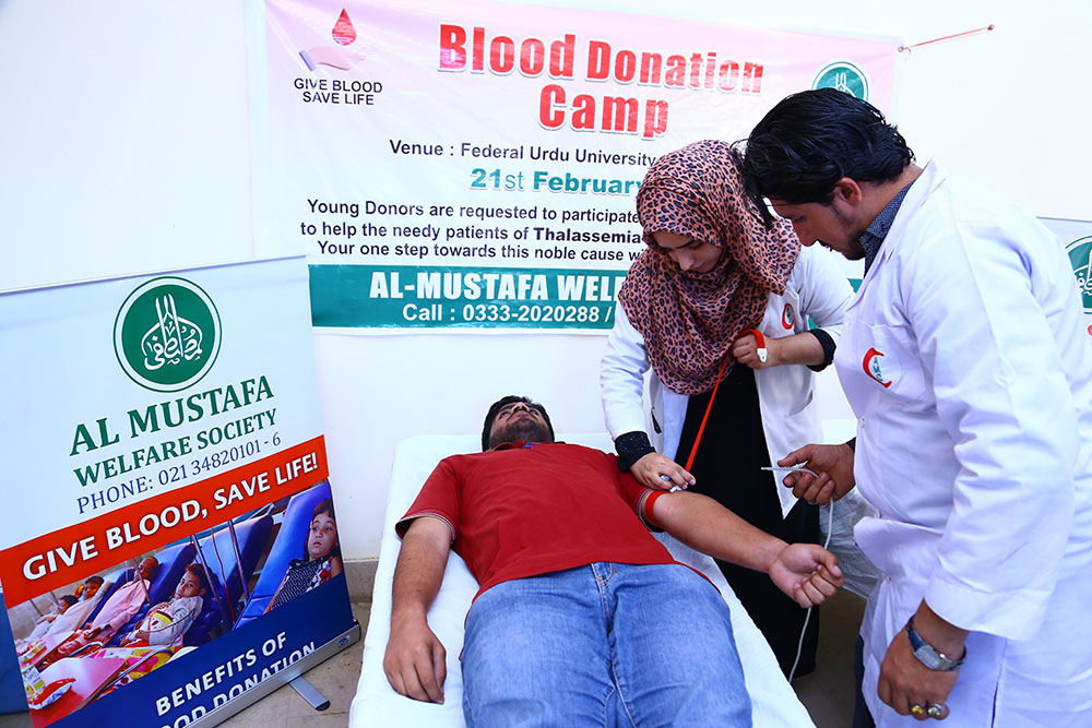 Blood donations are vital for supporting critically ill patients, particularly those suffering from thalassemia who require frequent transfusions. Al-Mustafa Welfare Society organizes blood donation campaigns at universities and community centres to encourage participation, particularly among youth. We educate donors on the health benefits of blood donation and provide them with results of screening tests performed on their donations.